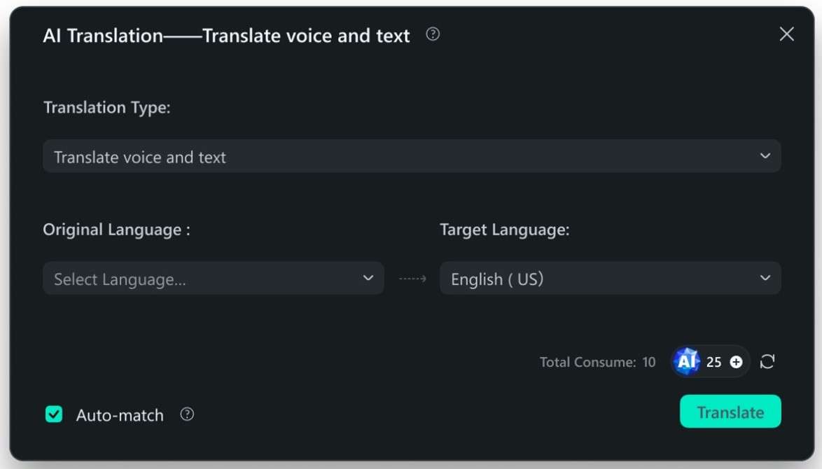 具体操作方面,Wondershare Filmora用户仅需选择待翻译视频/音频,点击AI翻译功能,选择原始及目标语言,并选择翻译类型,即可开始生成。值得注意的是,此次推出的AI翻译功能还支持同步生成字幕,并提供字幕文本单独翻译功能,为用户提供更多样化的翻译选项,满足不同用户的细分需求。