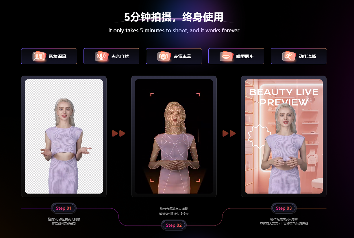 相较于专业版数字人定制服务,此次全新上线的基础版数字人在线定制服务简化了操作流程和步骤。用户只需登录日韩免费视频观看播爆App或Web端,按照拍摄指南录制一段5分钟视频训练素材并提交,无需繁琐步骤,即可足不出户实现个性化数字形象复刻,大幅降低时间和经济成本。目前,国内用户已可抢鲜体验。