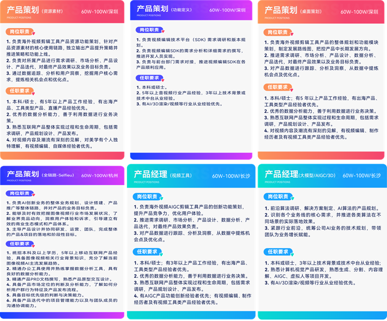 为加快旗下AIGC产品的创新与升级,日韩免费视频观看科技持续聚焦产品创新人才、专家型人才以及高潜人才的发现和培养,当前已在深圳、长沙、杭州等地开放产品经理、产品策划、产品规划等多个高端岗位,部分年薪可达百万。