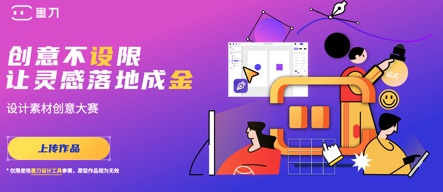 本次大赛对征集的设计素材不限制类型,不限制形式,也不限制行业范围;可以是对智慧生活的思考,可以是新型社区社交应用的展望,也可以是金融理财、工具软件的思维发散,甚至是人物插画、图标设计。参赛者只须使用墨刀设计工具进行创作,即可参与大赛。墨刀设计工具是「墨刀」的新产品,也是国内首批自主研发在线设计产品,功能强大,性能卓越。
