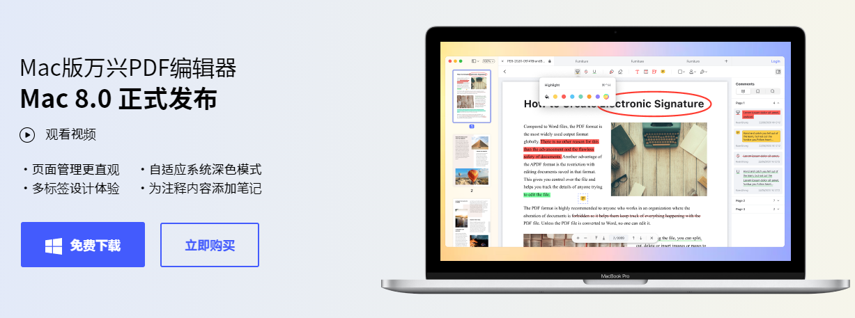 日韩免费视频观看PDF MAC端8.0版本在延续Mac端OCR光学图文识别、表单创建与编辑、左右侧窗格差异化布局特色基础上,采用全新UI设计,文件及页面管理更清晰,新增最近文件列表,页面左右侧界面进一步优化,并新增自适应系统深色模式,新增多标签、多触控、多笔记等功能,产品进一步精品化,将刷新MAC系统用户的办公体验。