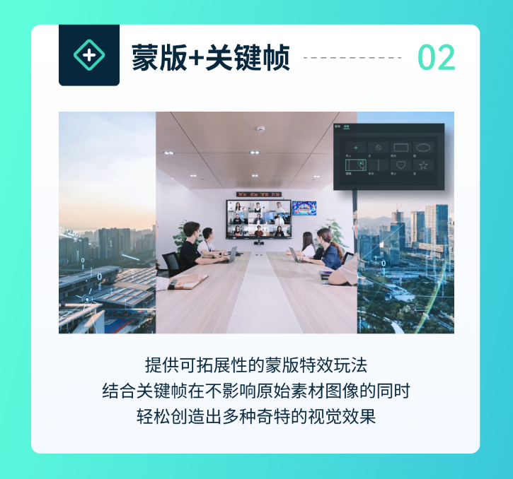 在遮罩+关键帧功能应用中,创作者可选择特定的视频片段或使用视频叠加层来隐藏、复制、显示或修改素材。通过调整遮罩的位置、宽度、高度和羽化效果,以及添加关键帧,还可以呈现不同的创意效果,可满足不同场景的无缝转场、MV场景的变换穿梭等应用。
