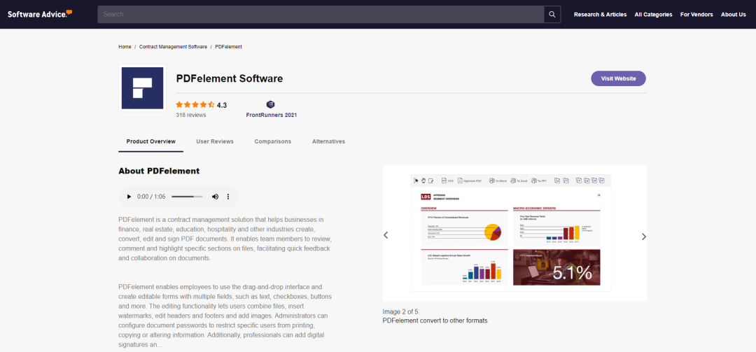 对于Wondershare PDFelement,这位最佳合同管理软件领跑者奖的“老朋友”,Software Advice官方给予了高度肯定:“Wondershare PDFelement提供合同管理解决方案,帮助金融、房地产、教育、酒店等行业领域的企业创建、转换、编辑和签署 PDF 文档,促进组织团队成员间的高效沟通与协作。”