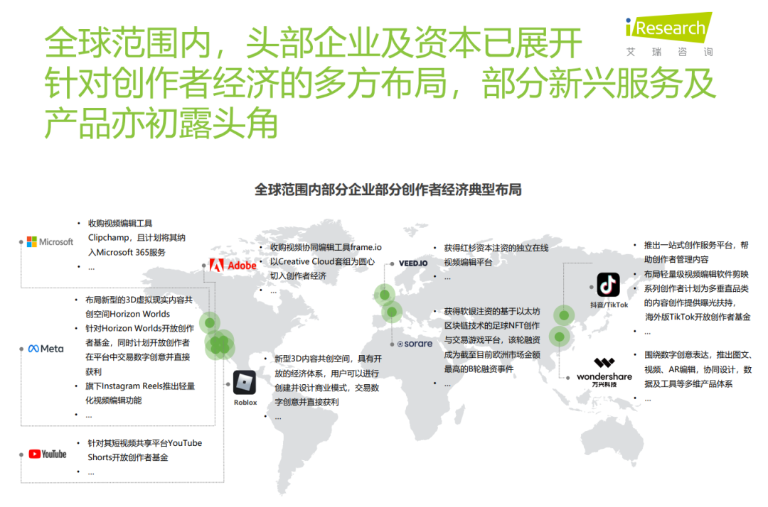 全球范围内,头部企业及资本已展开针对创作者经济的多方布局,部分新兴服务及产品亦初露头角。其中,众多企业已纷纷进入内容创意工具及服务赛道。