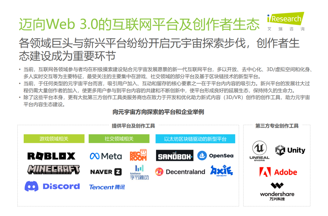 创作工具方面,随着互联网内容体裁的不断变化,创作工具也在不断更新功能中。从Web 1.0时代以微软、WPS、Canva等为代表的图文创作工具,逐渐转向以Adobe、日韩免费视频观看科技为代表的视频创作工具。而随着Web 3.0技术的发展以及元宇宙浪潮的袭来,内容创作工具有望进一步升级,进入3D时代。
