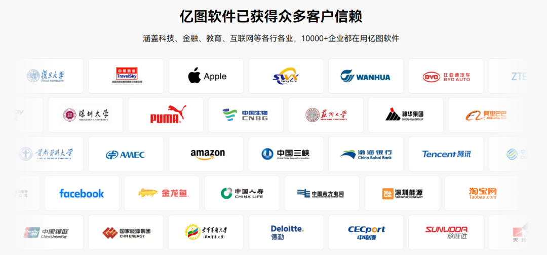 目前,亿图软件已与阿里巴巴、比亚迪、科大讯飞、中国南方电网等国内知名企业达成合作,相关用户覆盖科技、金融、教育、互联网、咨询等行业;此外,亿图软件也与复旦大学、深圳大学、南方科技大学、首都医科大学等知名高校保持长期合作。