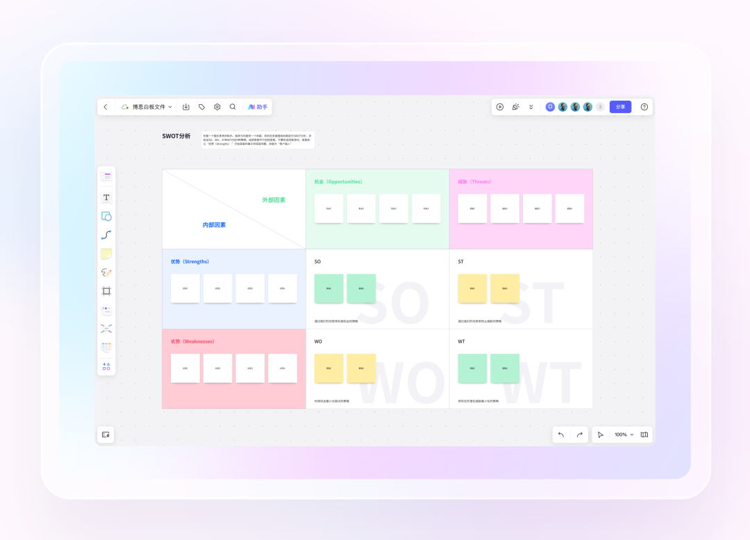 AI生成商业画布:boardmix提供一键智能生成商业模式画布模板、SWOT分析模板、用户画像模板等AI功能;可广泛应用于商业研究、市场分析和用户调查等场景,帮助产品经理迅速了解目标市场和用户。