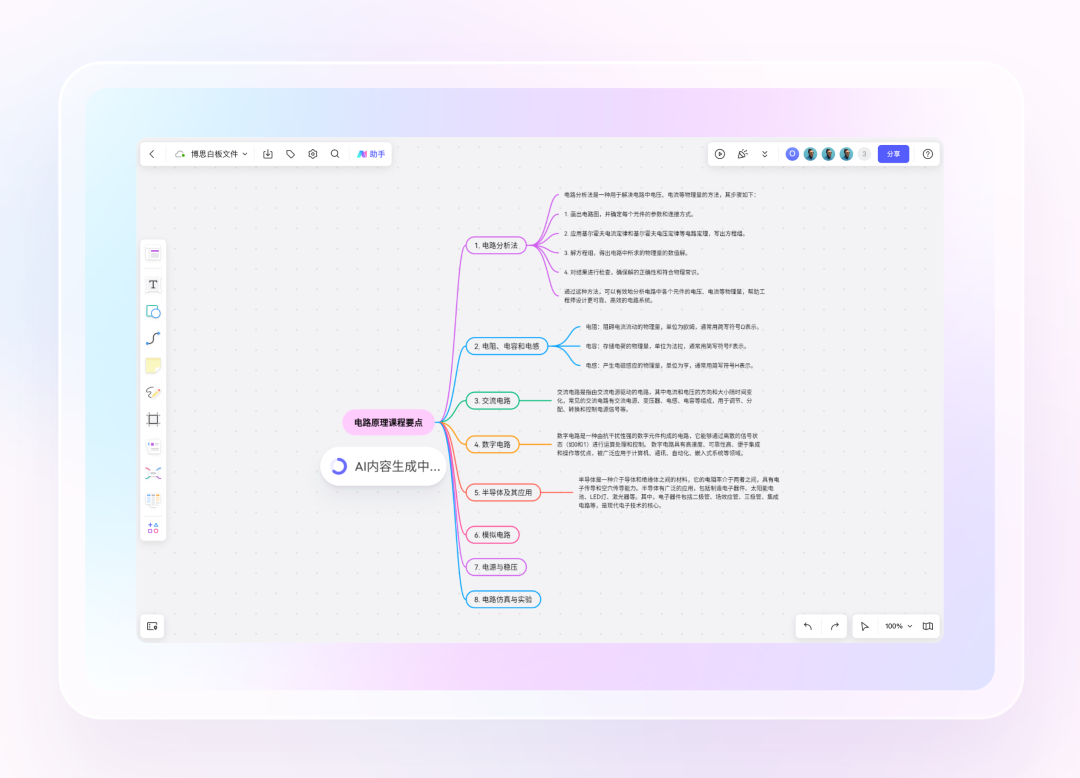 AI图表生成:boardmix AI助手提供思维导图、流程图等多种图表类型一键AI生成。围绕给出的主题或关键词,它能够从多渠道搜索资料和信息,进行思维发散拓展,并以不同形式进行内容展现,省去用户大部分基础思考和简单操作,拓展思维边界、激发创新灵感。此外,AI生成的流程图生成还助力知识梳理、流程规划和智能决策,从而快速理清思绪,专业呈现。