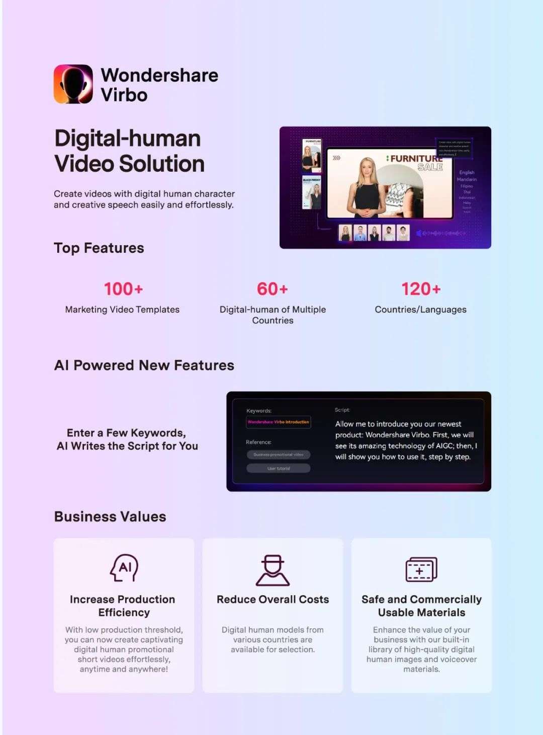 Wondershare Virbo已全新推出“0门槛AI生成脚本”功能,为用户带来从脚本、到“真人”出镜、到视频自动生成的“全链路AIGC创作”体验。用户输入关键词,即可一键生成营销文案,大大节省了在文案构思上耗费的时间与精力,并解决多语言脚本翻译等难题。