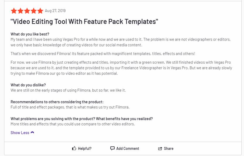 值得一提的是,“ Winter 2020”非常看重真实企业用户对于产品的评价。为确保每一条评测都是用户真实的声音,G2采用专业账户绑定注册评论以及人工审核机制。从G2平台可看到,众多来自不同国家不同行业的企业用户,被Filmora产品家族强大的视频编辑功能所打动,纷纷给与了“便捷高效” 、 “拥有丰富的资源特效”、“拥有完善的功能包模板”等高度评价。